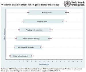 One of the most important areas in developmental milestones is gross motor development. Gross motor refers to the physical movements that involve using the large body parts. The charts below can be referred as a guideline in monitoring the milestone.