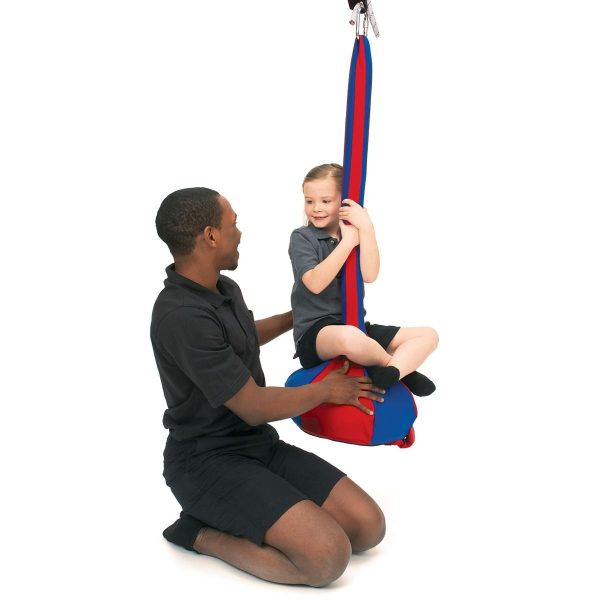 Eureqah Kids’ Moon Swing is a great means for addressing bilateral coordination, balance, strength and vestibular input. Its size and shape allows the therapist to create an easy mount and dismount for clients. The soft gooseneck is extra long to help the child hang on.